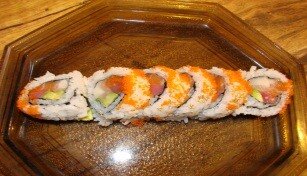 Salmon, Tuna, White Tuna, Avocado, w/ Crunch, Masago on Top, Triple Sauce
