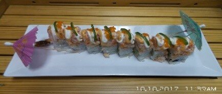 Fried Shrimp, Avocado, w/ Spicy Tuna, Jalapeno, Masago on Top, Triple Sauce