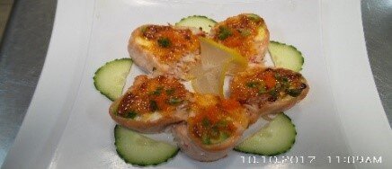 Salmon Wrap, Crab, Avocado, Cream Cheese, w/ Masago, Green Onion on Top, Spicy Mayo, Eel Sauce, BAKED